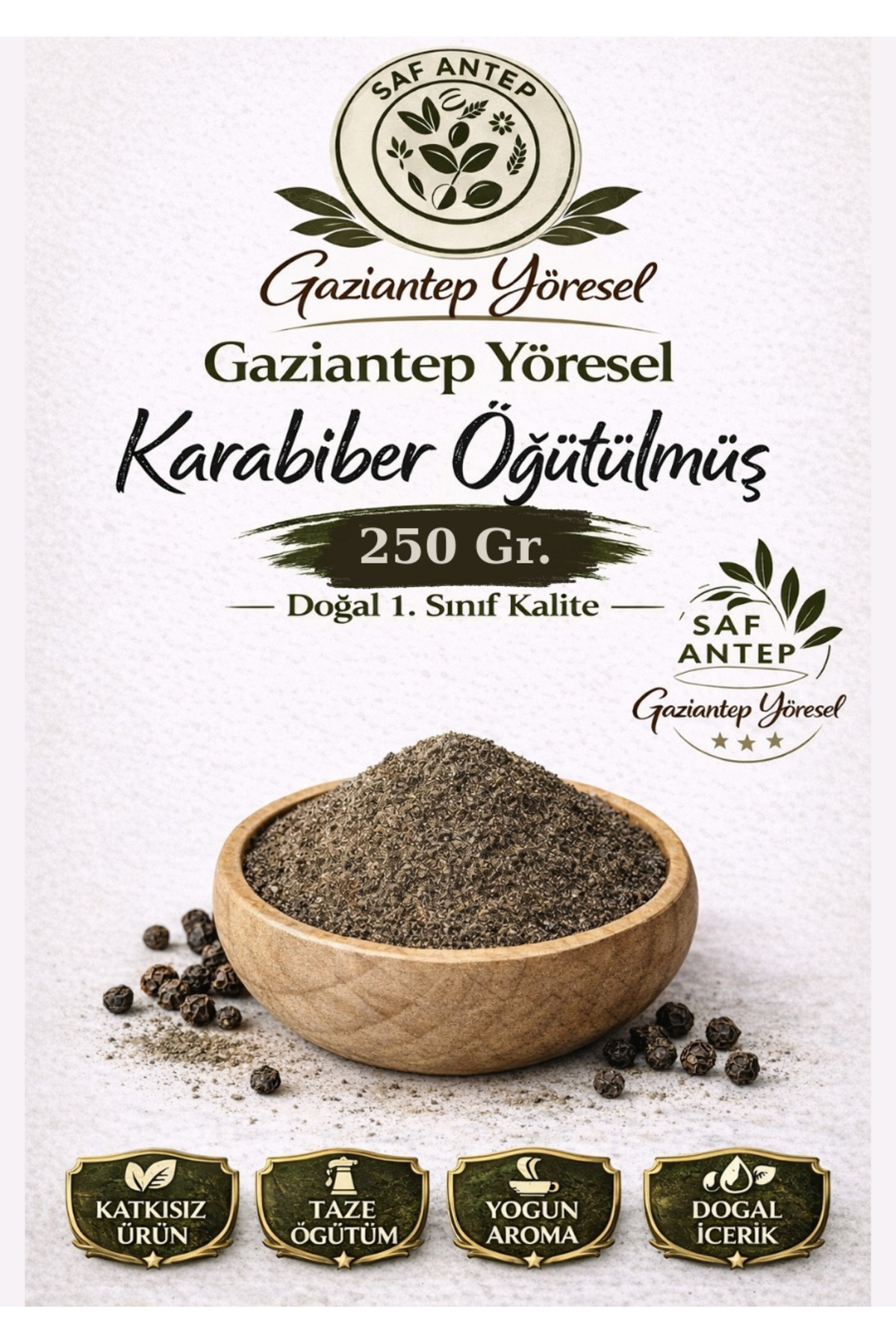 Gaziantep yöresinden doğal karabiber, 1. sınıf kalitede katkısız ve taze öğütülmüş geleneksel bir baharat olarak sunulmaktadır.