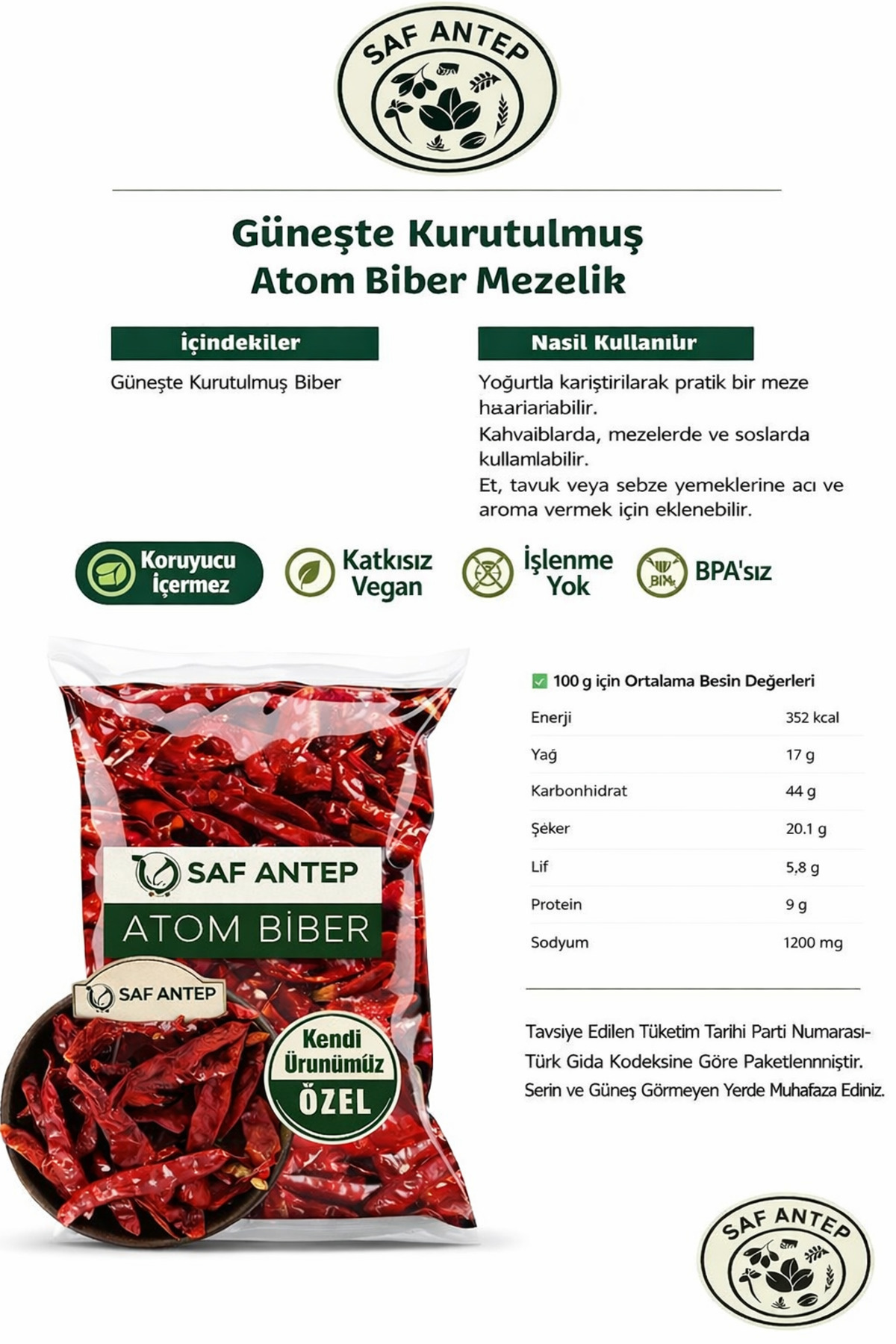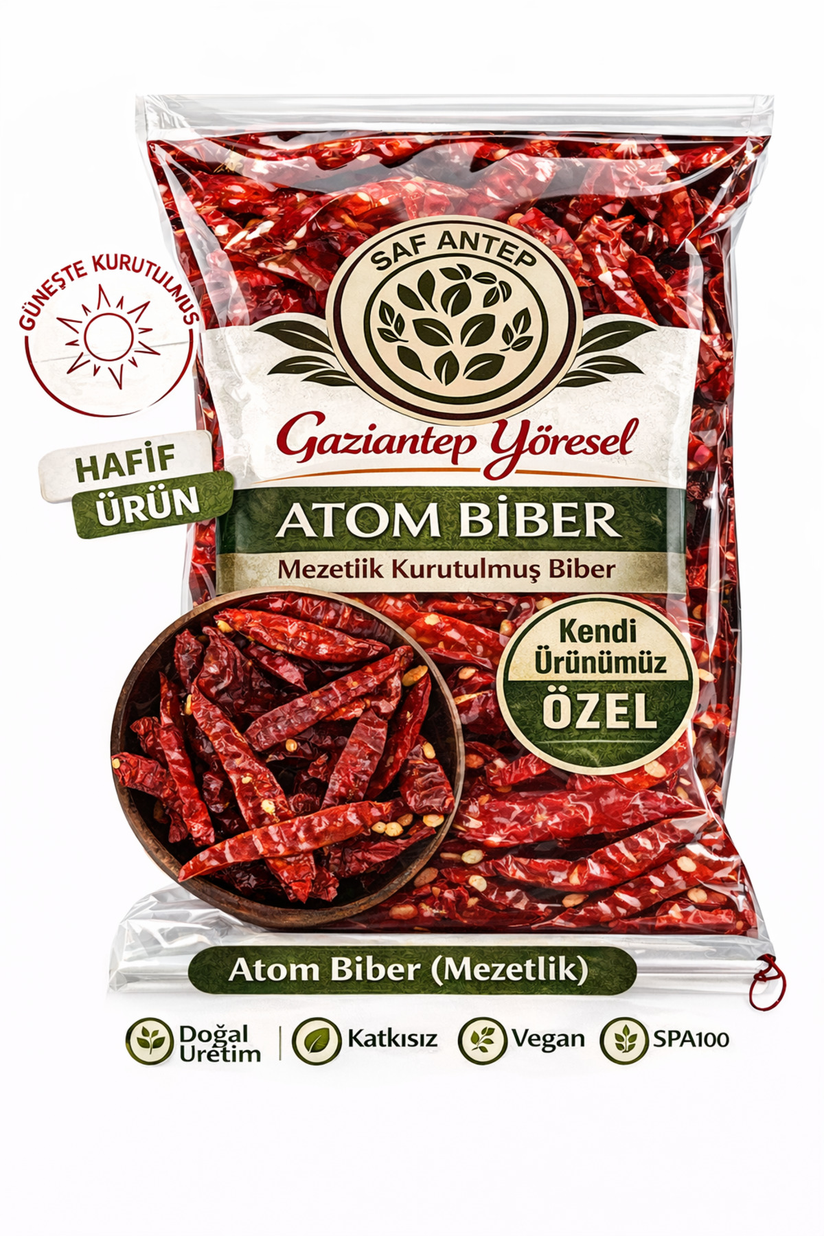 Saf Antep Atom Biber, Gaziantep’in sıcak güneşinde doğal yollarla kurutulmuş, yoğun yakıcılığıyla öne çıkan özel bir biber çeşididir. Atom biber olarak bilinen bu ürün, küçük boyutuna karşın son derece güçlü bir acılık barındırır ve Antep mutfağında özel bir yere sahiptir. Katkı maddesi, renklendirici veya koruyucu içermeyen bu ürün, doğal acılığını ve aromasını eksiksiz korur. Farklı gramaj seçenekleriyle az ya da çok miktarda tercih edilebilen atom biber, acı seven damak tatlarının gözdesi haline gelmiştir. Serin ve kuru ortamda muhafaza edilmesi önerilir.