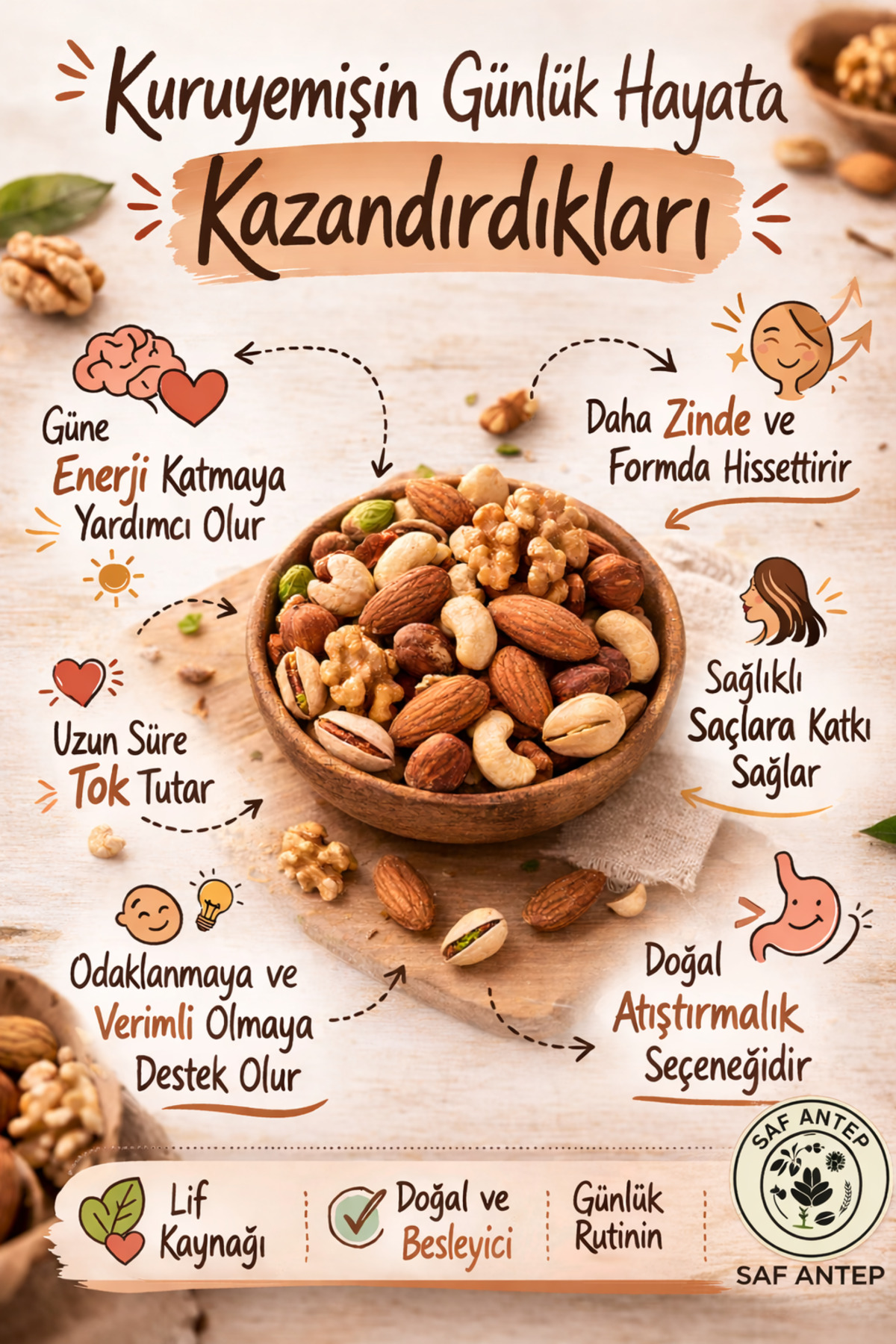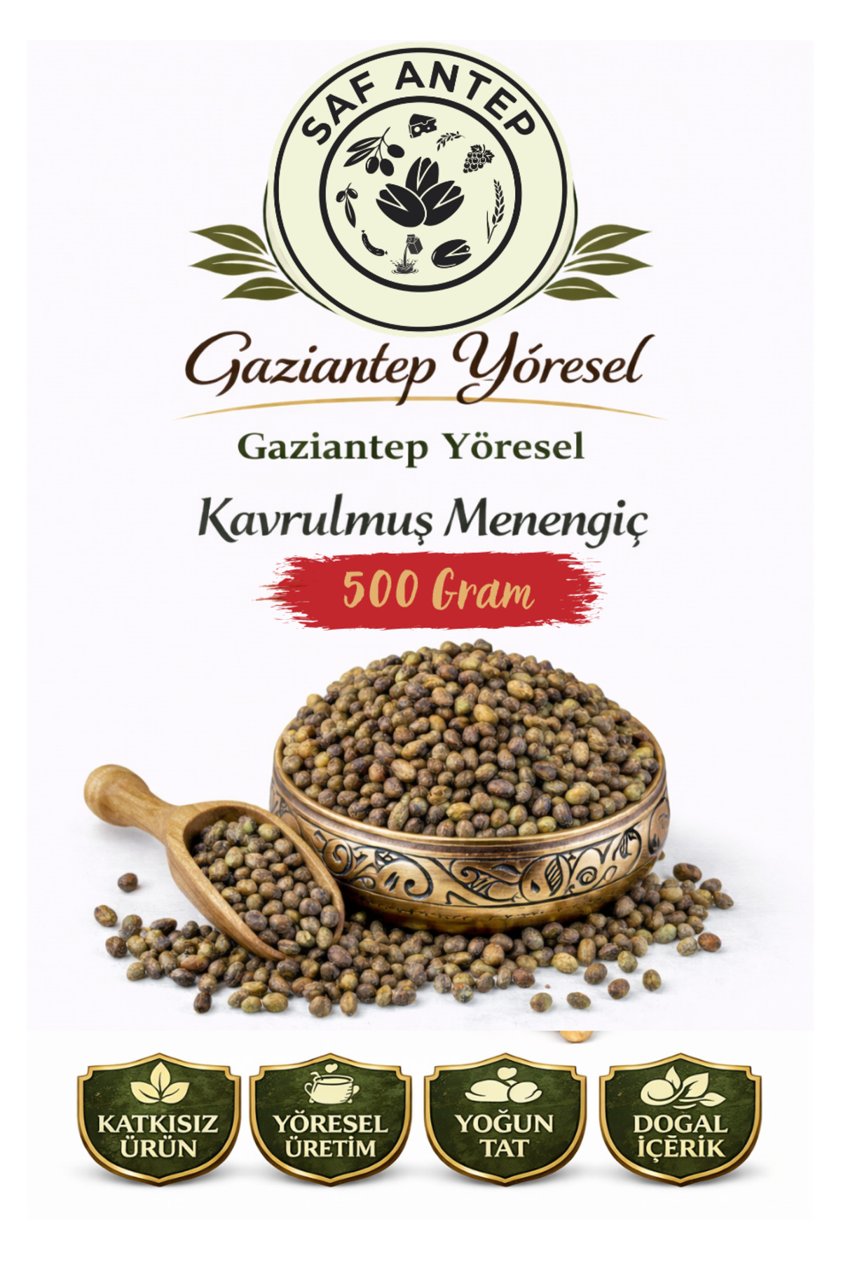 Saf Antep Kavrulmuş Menengiç, Gaziantep ve çevresinin dağlık alanlarında yetişen yabani menengiç ağaçlarının meyvelerinden elde edilir. Geleneksel yöntemlerle kavrularak hazırlanan bu özgün ürün, yöresel kahve yapımında ve atıştırmalık olarak tüketimde yaygın biçimde kullanılır. Kafein içermemesi nedeniyle çay ve kahveye doğal bir alternatif oluşturan menengiç, katkı maddesi ve koruyucu içermez. Gaziantep mutfağının nadide lezzetlerinden biri olan bu ürün, zengin aroması ve kendine has tadıyla sofralara özgünlük katar. Serin ve kuru bir ortamda muhafaza edildiğinde uzun süre tazeliğini korur.