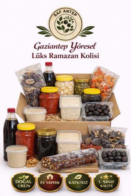Gaziantep yöresel ürünlerinden oluşan ultra Ramazan kolisi, doğal ve katkısız geleneksel lezzetleri bir arada sunan özel bir hediye setidir.