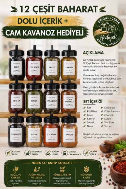 Gaziantep Yöresel 12’li Baharat Seti – Dolu İçerik, Cam Kavanoz Hediyeli
