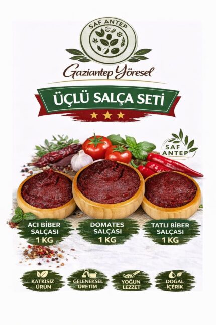 Gaziantep Yöresel 3lü Salça Seti (Acı + Tatlı Biber + Domates) 1 KG x 3 – Doğal & Katkısız